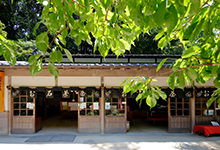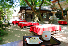 本殿から奥へ続く梅林を進むと、境内の一番奥にあるのがこの茶店。大正期に建ったという古風な店内では、太宰府名物の「梅ヶ枝餅」や特製お石弁当、うどんなどが食べられます。青葉や紅葉、梅の季節なら、外のテーブル席が快適。ちなみに、明治時代にこの茶店を始めた“お石さん”は美人で名高く、政財界のファンも多かったとか。茶屋奥のトンネルは、その一人で炭鉱王の麻生多賀吉が、お石さんの通勤が便利になるように掘ったという伝説もあります(別説もあり)。