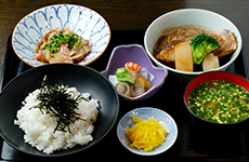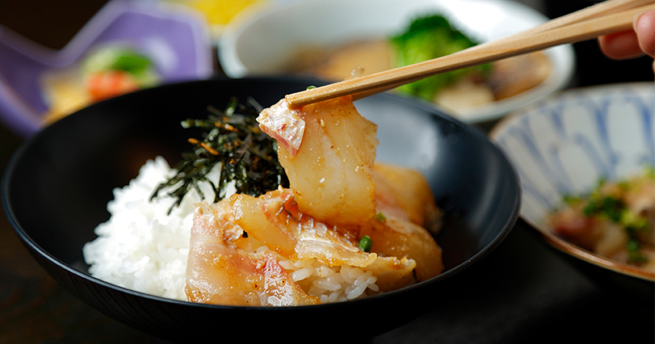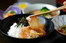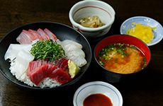 長浜の「魚市場会館」1階では、観光客も自由に入れる食堂街が人気。 場所がら、素材の鮮度や美味しさはまさに“折り紙つき”。 ここ「魚がし」も、昼時には行列必至の人気店です。 海鮮丼の魚の切り身もピンと角が立って、食感やとろけ具合も最高。 玄界灘から揚がった鯛を特製ダレで漬けた「鯛ごま」の定食も、人気メニューです。 家で再現したい方は、タレやポン酢も売っています。