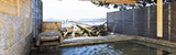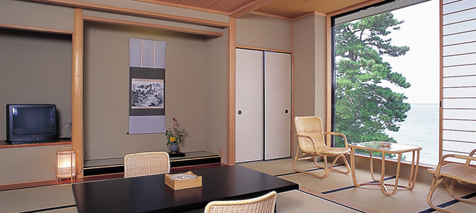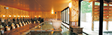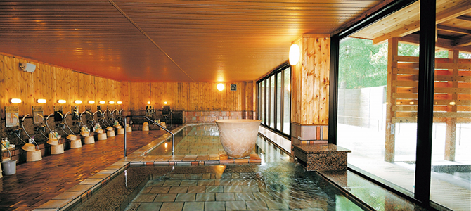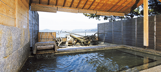 萩焼作家 金子信彦の作品を随所に取り入れた館内、白い砂浜の菊ケ浜、その奥にはコバルトブルーの日本海が広がります。全体が萩焼でつくられた陶芸風呂がおすすめです。