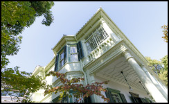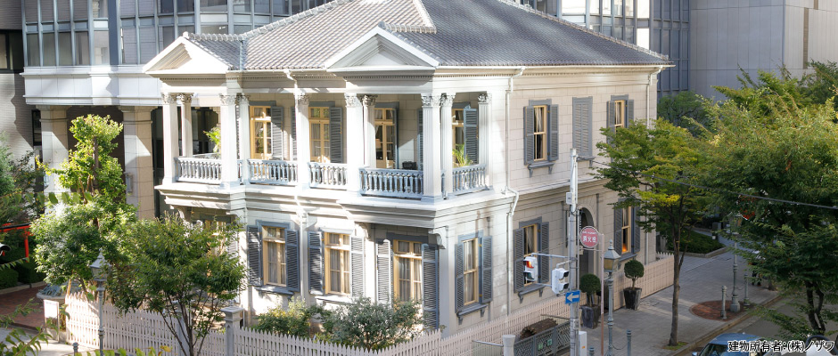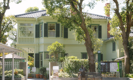 大きな楠の木に包まれ、淡いグリーン色がかわいい洋館