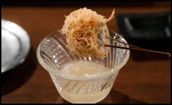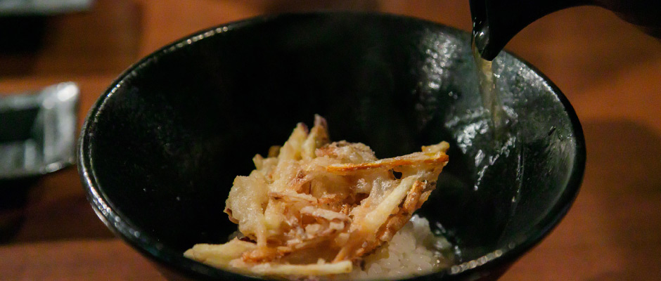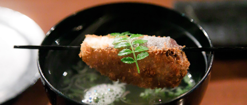 串カツを、和の技法を取り入れた創作料理として昇華させ、ミシュランに2年連続掲載された実力店。JAZZが流れ、カウンター席のみの落ち着いた雰囲気で提供されるのは、コース料理(10串3,024円・15串4,536円)のみ。季節の食材を、組み合わせの妙や調理方法で魅せる、創意工夫に富んだ串との出会いに心躍ります。サバやアジ、ウルメ節で引いた出汁に落として食べる「創作お椀串」と、〆の「かき揚げ茶漬け」は店の名物メニュー。