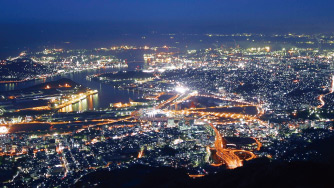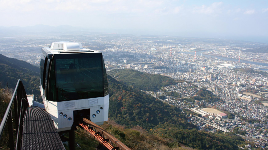 国内屈指の夜景の名所。ケーブルカー、スロープカ―を乗り継いで登る標高622mの山頂にはレストラン併設の展望台があり、視野角200度を超える大パノラマが広がります。日本五大工場夜景の一つである「北九州工場夜景」も楽しめます。