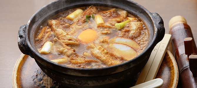 だからこそ、麺類でも当然のように誕生したのが「味噌煮込うどん」。老舗の一つ「山本屋総本家」でも、創業当時(大正14年)からの味が楽しめます。土鍋のふたを開けると、フワッと立ち上る味噌の香り。太めの麺は固めが特徴で、かみしめるごとに小麦の風味が広がり、味噌との相性もさすが。赤味噌は加熱しても風味が飛ばないのが特長なのです。