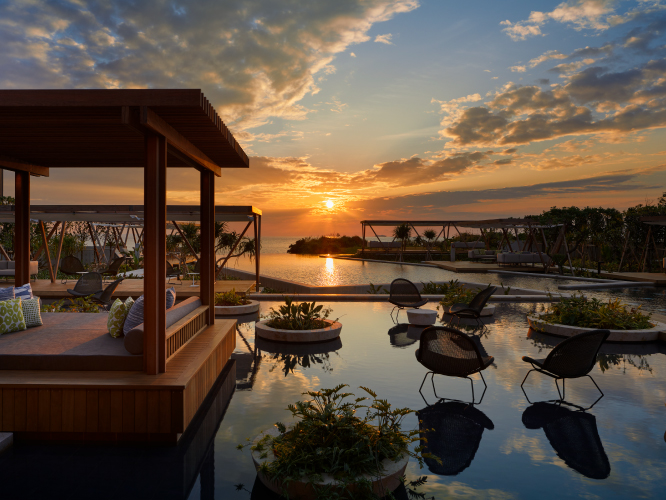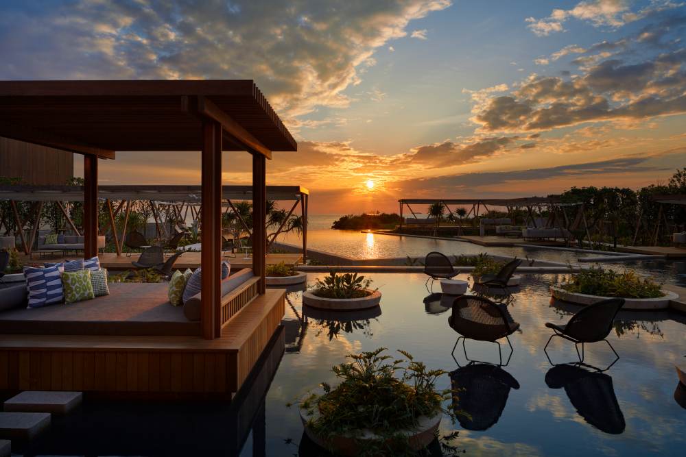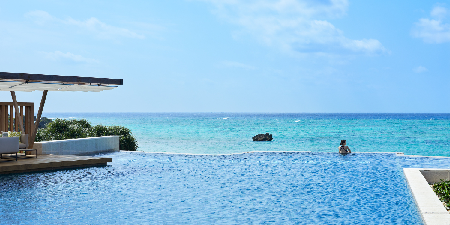 海に向かって開かれたプールでは、場所や時間帯によってさまざま過ごし方が楽しめます。海にせり出たエリアには水中に腰掛けられる段差があり、夕暮れ時には正面に沈むサンセットを眺める特等席となります。加温式のため、一年中楽しむことができ、季節や時間により移り変わる沖縄の風や空の色の変化を感じられます。