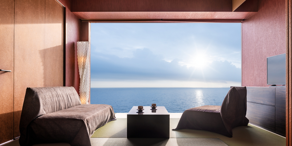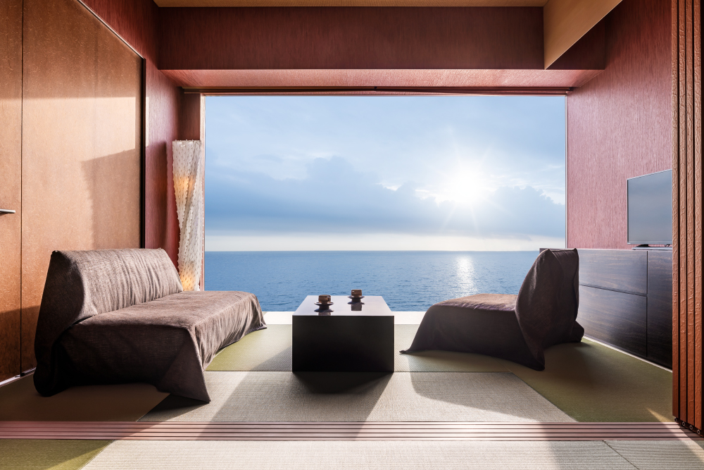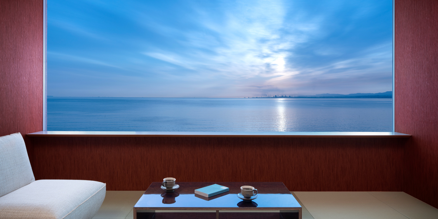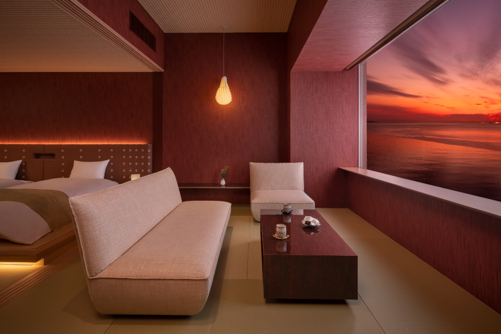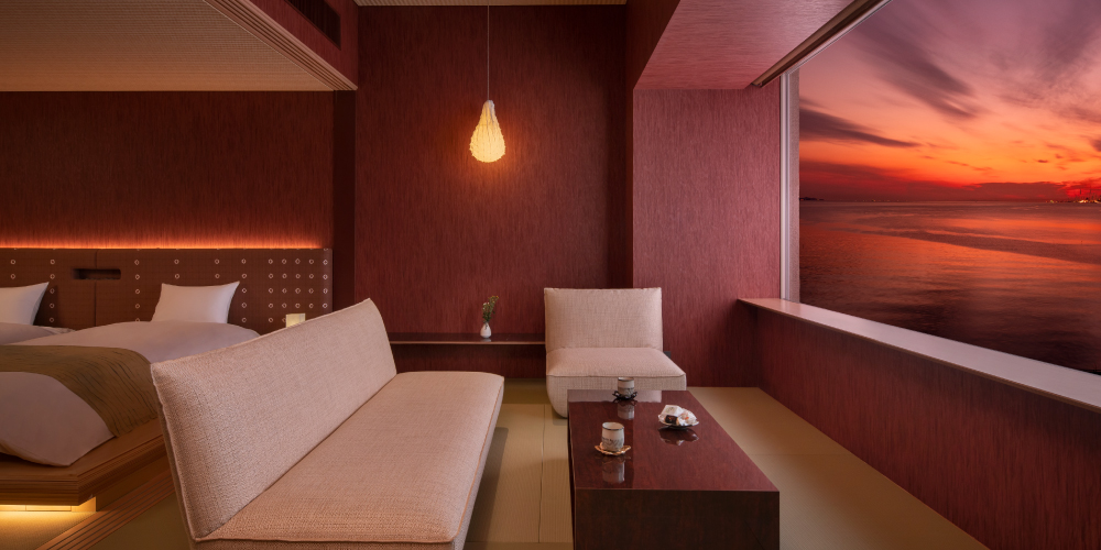 海の景色を絵画のように楽しめるピクチャーウィンドウが特徴的な客室は全室オーシャンビュー。天気や時間で刻々と表情が変わる大海原の眺めが圧巻です。海の色を引き立たせるため、室内は別府の溶岩大地から噴出する「血の池地獄」の赤から着想を得た柿渋色。落ち着いた柿渋色と大海原のコントラストをお楽しみください。
