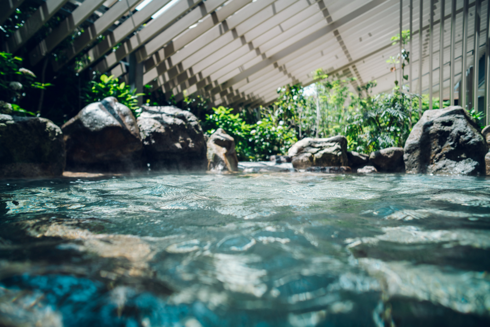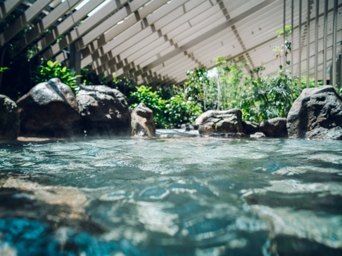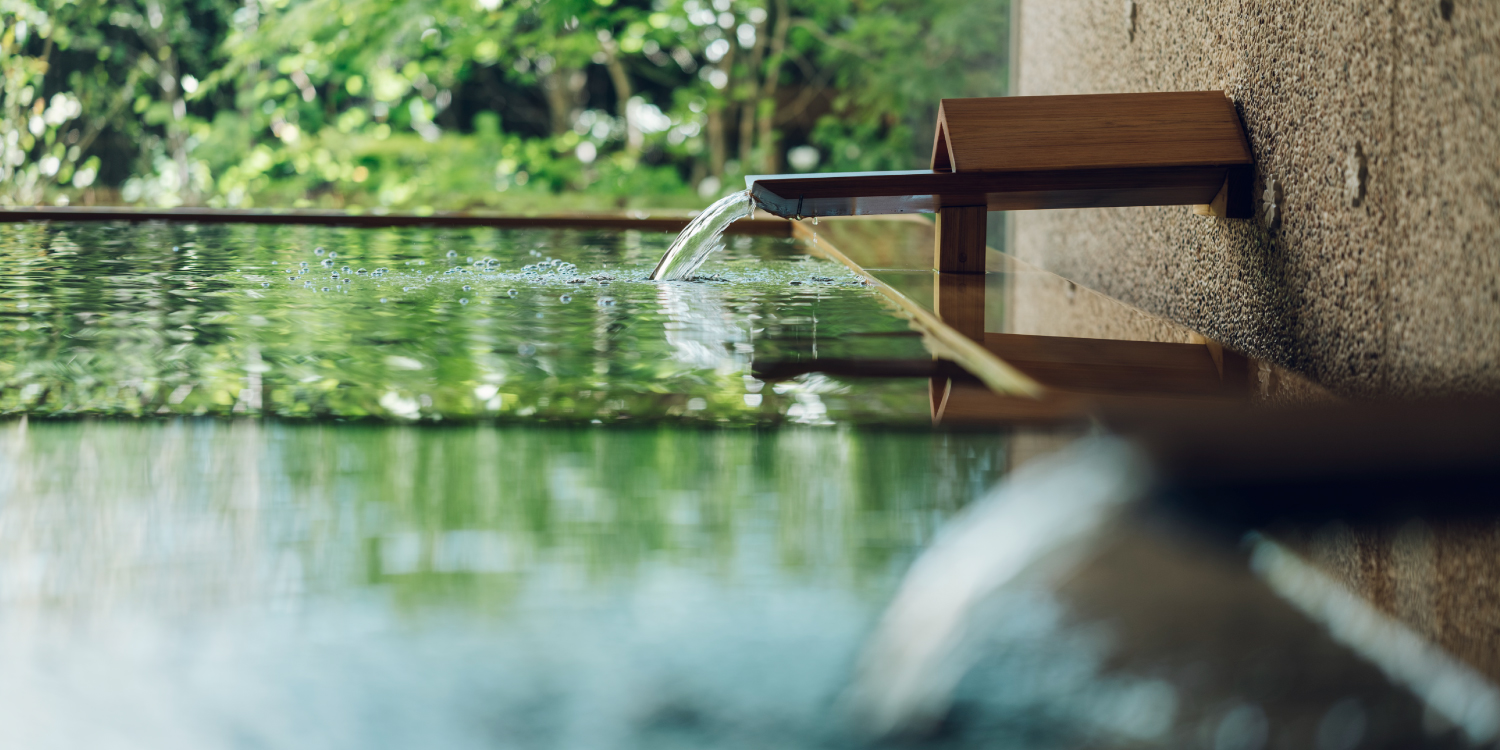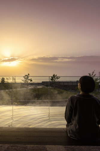 海に近い別府温泉は塩泉で、重曹成分を含むため身体を芯から温め、肌を滑らかに整えます。内湯には8種類の山の花をモチーフにした臼杵焼の壁が輝き、爽やかな風を感じられる開放的な足湯では、目前に広がる別府湾を眺めながらお過ごしいただけます。時の移ろいにより、表情を変化させる海景をお楽しみください。