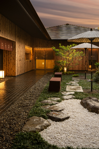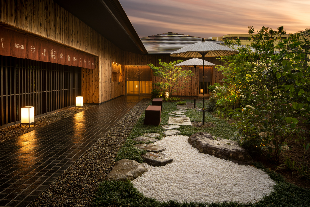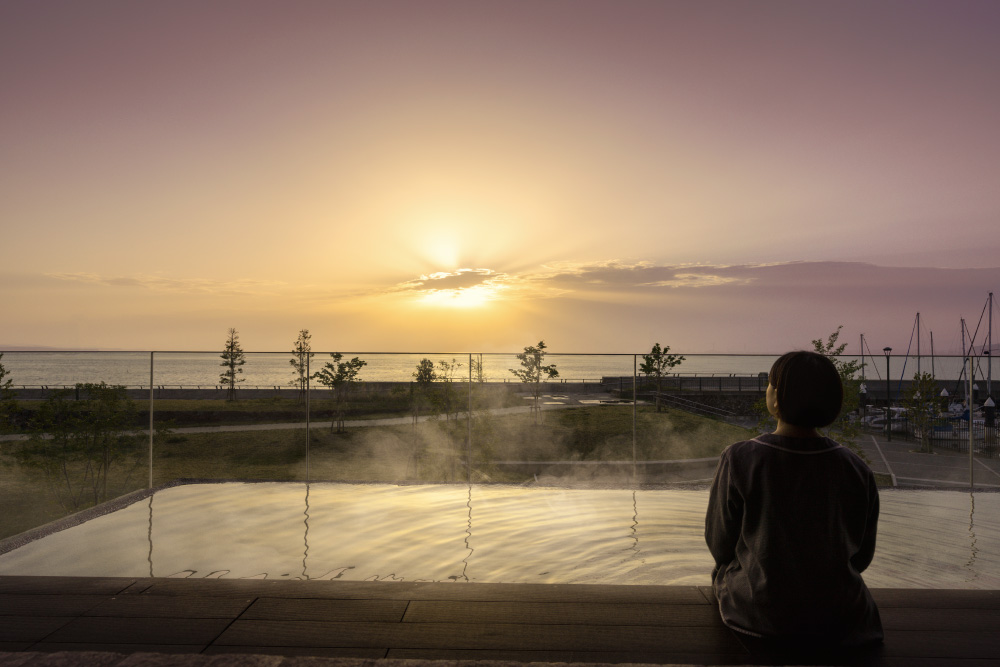 昼、夜、朝で様々な表情を見せる館内の温泉街。到着後は爽やかな海風を感じる足湯での夕涼みや客室でゆったりと別府湾を眺めるひととき。夜は賑やかな別府の街のように、館内が様変わり。湯けむりが漂い、温泉名人が登場するラボや庭園で夜店が登場します。翌朝は朝陽を浴びながらの別府温泉絞り体験をご用意しています。