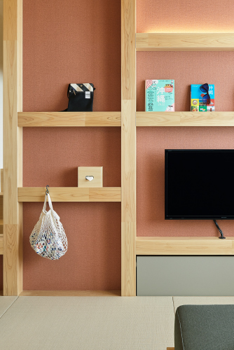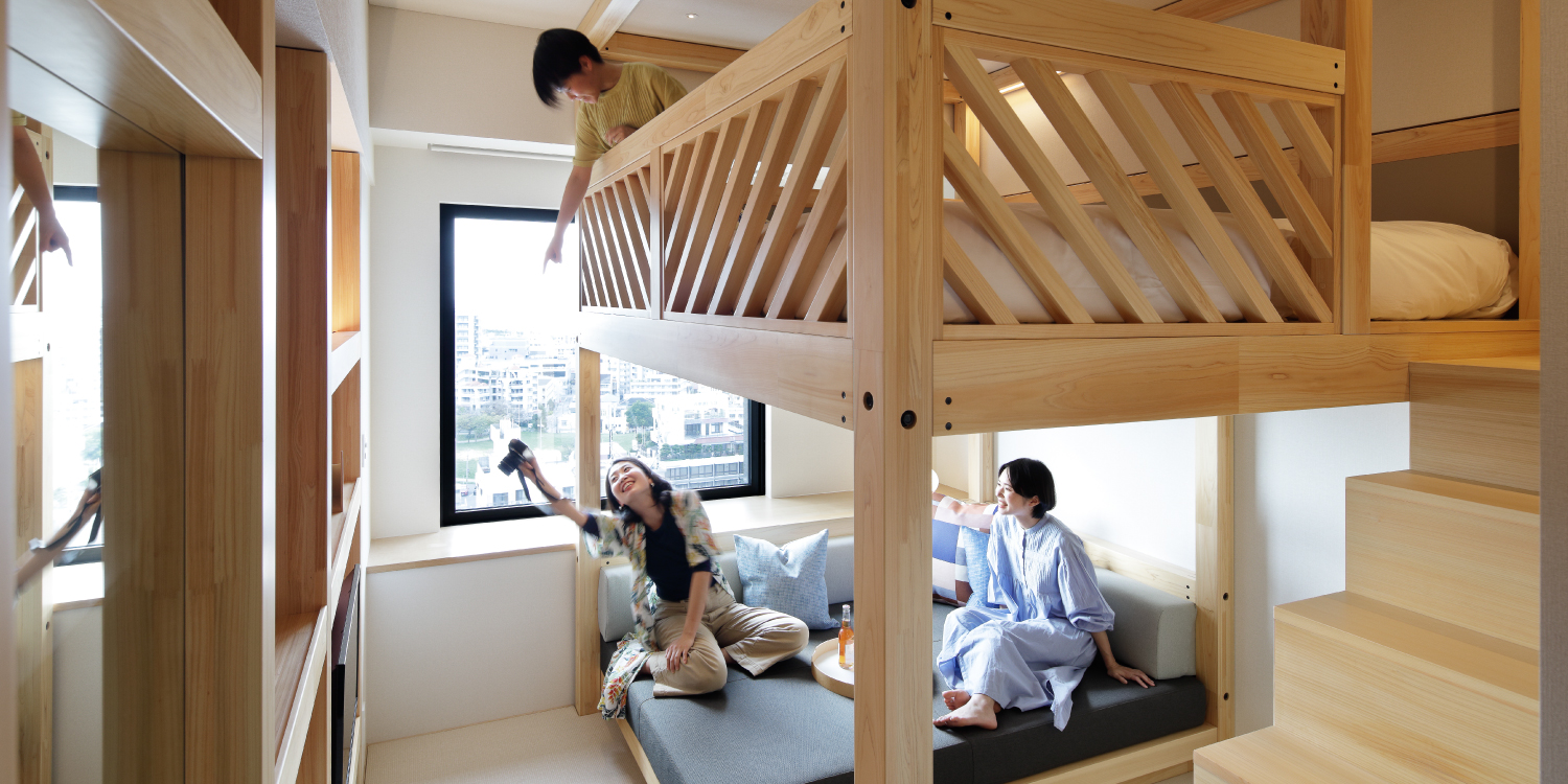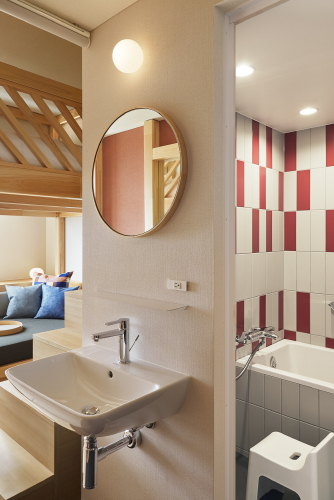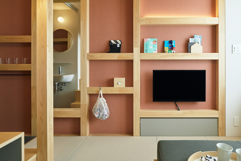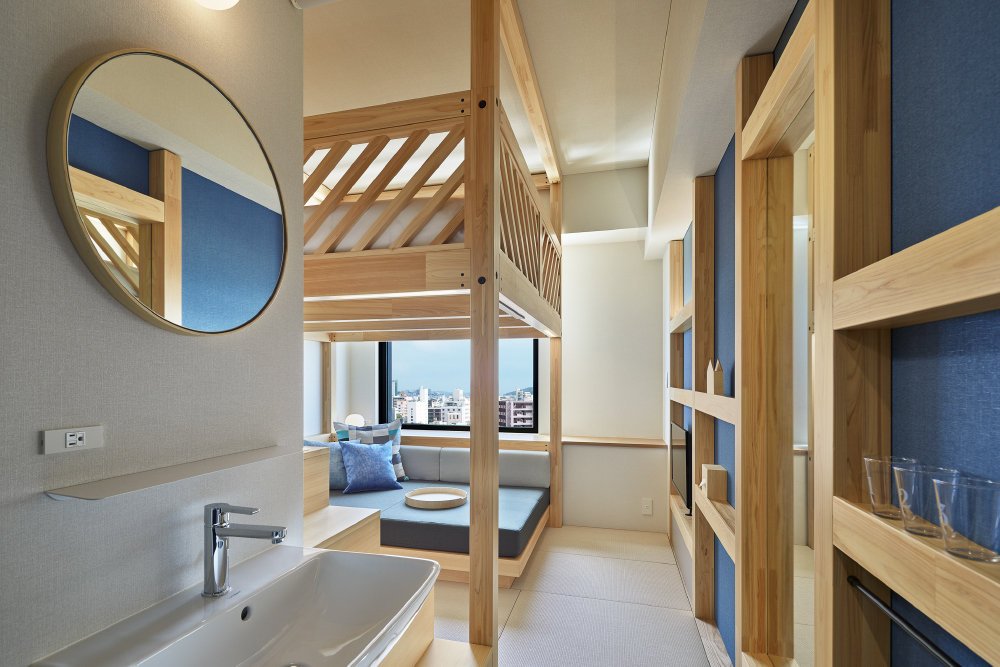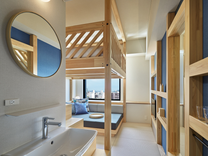 客室は「やぐらルーム」、「ダブルルーム」、「ツインルーム」の 3 タイプ 。床は和紙畳のため、靴を脱いで裸足でくつろげます。足を伸ばせるソファスペースや収納に使用する仕掛け壁、バス、トイレ別など、コンパクトながら機能的で使い勝手が良く、リラックスして過ごせます。