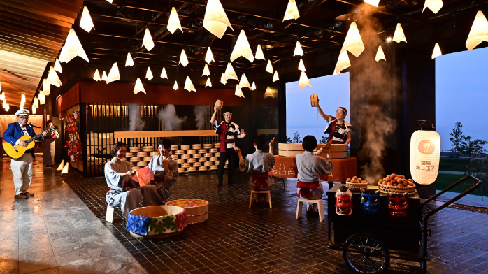 明治時代に開港し、湯治客でにぎわいを見せた別府温泉街。館内は、和紙のちょうちんが照らす石畳の路地や、温泉街にある土産店、夜店をイメージした空間など、賑やかな別府の温泉街を彷彿させるつくりです。
