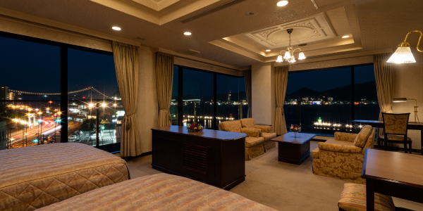 関門海峡が一望できる角部屋。座り心地にこだわった上質のソファで、とびきりリラックス。格調高い調度品は、優雅な気分を誘います。