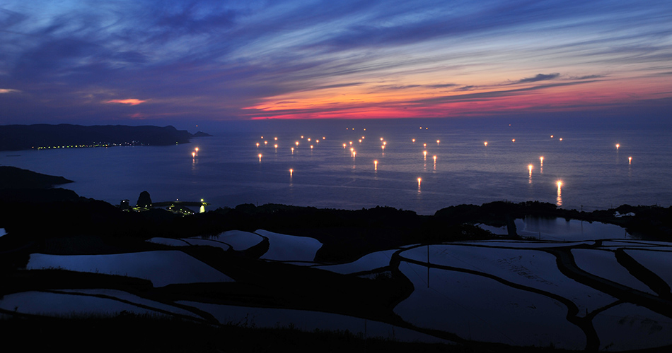 陽が沈んだ後もシャッターチャンスは続きます。それは、海上で操業するイカ釣り漁船の漁り火とのコラボレーション。シーズンの5月下旬からは近隣の漁港から何十艘もの漁船が出港します。棚田越しにイカ釣り漁船の漁り火が無数に輝く風景は、見るものを圧倒する美しさ。遠景に火が灯ると、あたりから感嘆の声が上がるほどです。漁り火が見えるのは例年8月上旬頃まで。日曜の夜に漁に出る船が多いそうなので、狙い目かもしれません。
