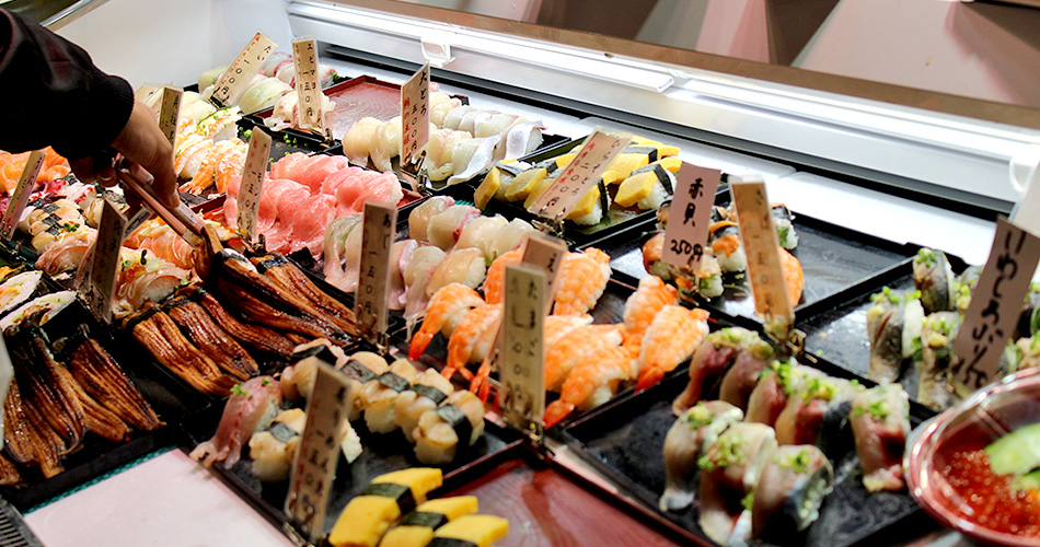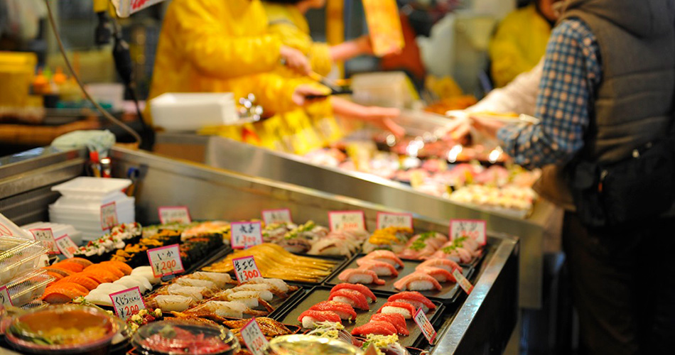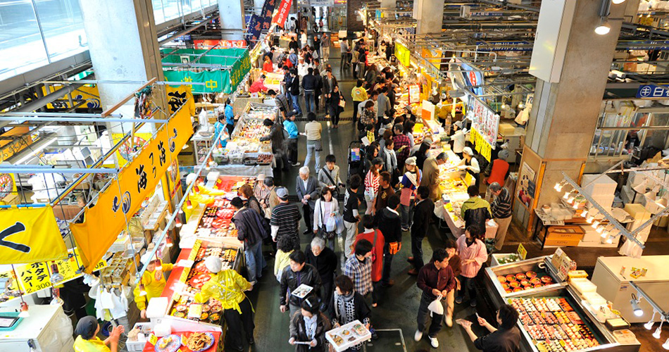 市場内には獲れたての魚介類がずらりと並び、お客様に直接販売するスタイルです。お寿司一貫から購入でき、熱々のふく汁や、揚げたての魚介類と一緒に、すぐそばのテーブルで食すこともできます。