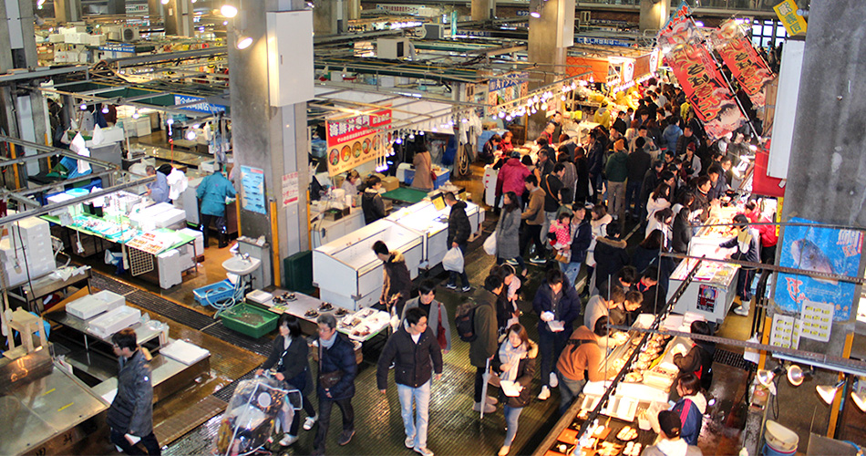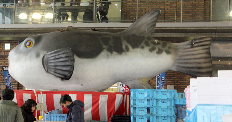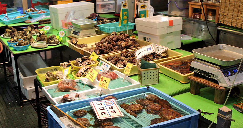 春はイサキやアサリなどの貝類、夏はサザエ、ウニ、アワビ、秋はイカ、サンマ、サバなど、種類豊富な食材に目移りします。そして冬はやっぱり「ふく」。冬の代表魚として「とらふく」は別格ですが、ブリやアラ、カキ、アンコウなどの鍋物の食材も豊富。季節を感じられる旬の味覚が満載の市場は、地元人にも観光客にとっても魚好きにはたまらないスポットと言えます。