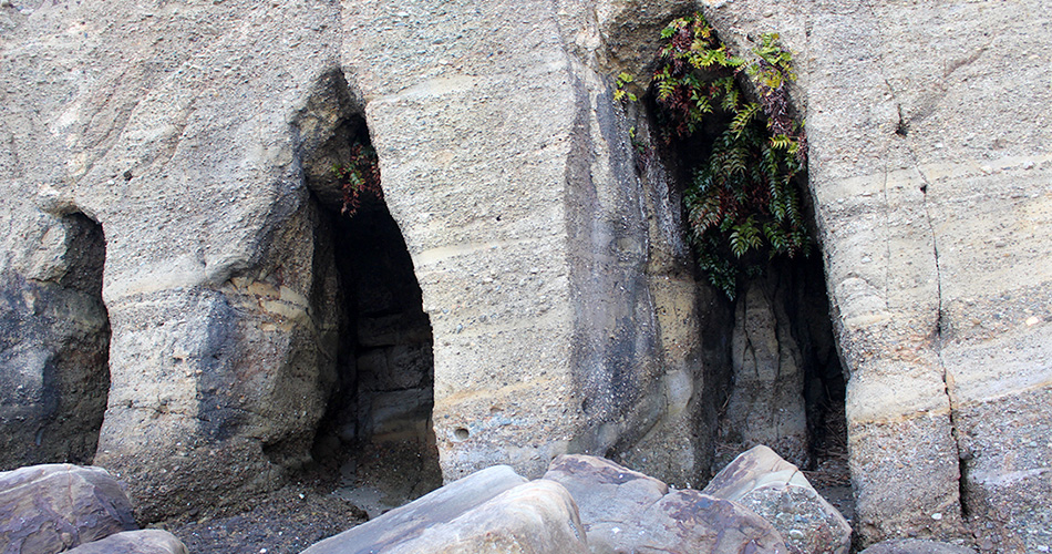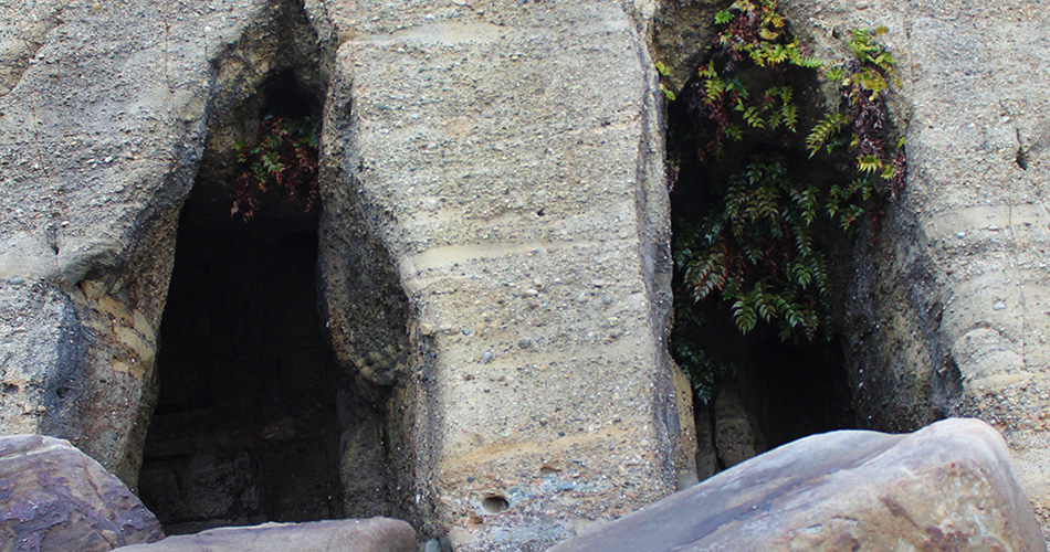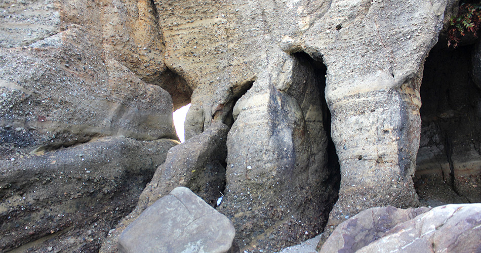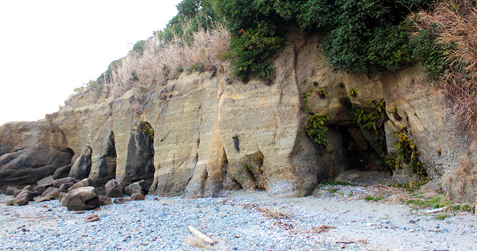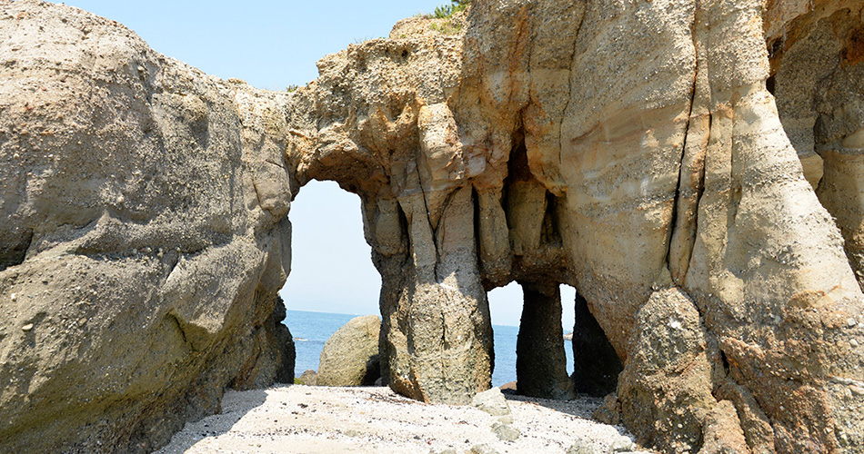本山半島最南端の本山岬にある奇岩、通称「くぐり岩」は、海食が進んだ結果、海食洞が貫通してトンネル状になったもので、山陽小野田市では有名な観光スポットになっています。トンネルは大小あわせて3本あり、最大のもので、高さ約3mもあります。「くぐり岩」へは、本山岬公園の駐車場から坂道を下って海岸に出ますが、干満の差が大きく、満潮時は海に沈んでしまうので、引き潮時でないと行けません。