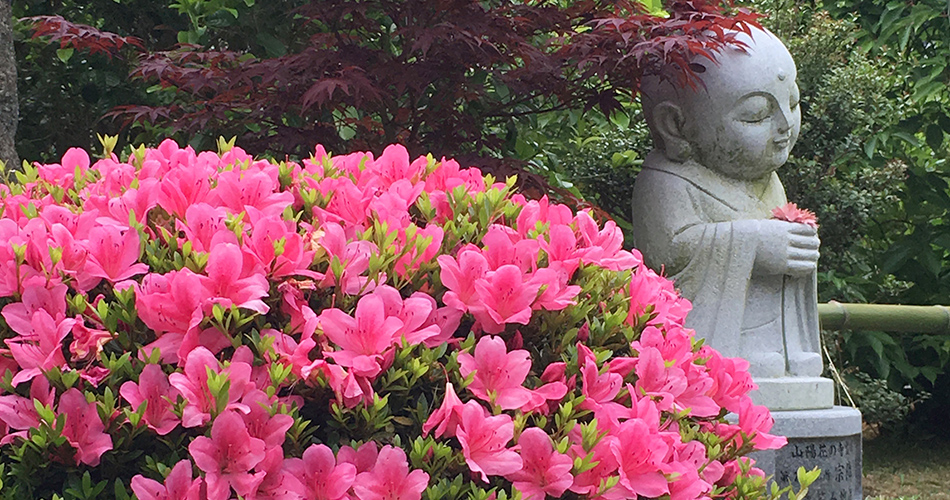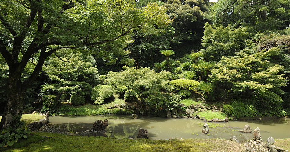 深淵な禅の真髄を説くという閑寂な趣きの庭で「宇部の和」を存分に味わうことができます。山水の景色を表現し、池中には希望の出船を前に帆を休めて佇む様を表した「夜泊石」が置かれています。秋の紅葉が有名ですが、新しい生命の息吹を感じさせる新緑の季節は新たなパワースポットとして人気です。