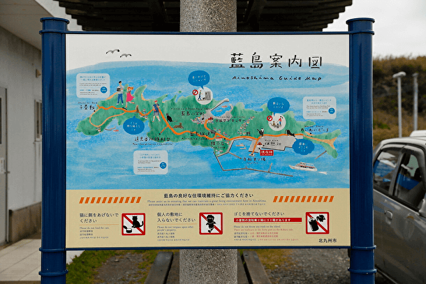 島に着いてすぐ目にふれるイラスト看板。こちらにルートが描いてあるのでぜひチェックを。 (看板の左下に、餌をあげないでくださいと書かれているとおり、民家や道路の真ん中、作業場、商店の前などでの餌やりは禁止となっています。もし猫たちにおやつをあげたい場合は、「ここであげてください」と書かれている場所で、マナーを守ってあげましょう!詳しくはこの記事の下部をご覧ください)