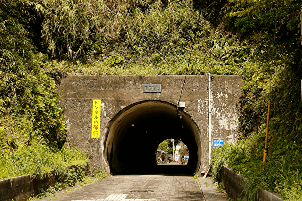 木村港から徒歩約15分のところにある島唯一の小さなトンネル。昭和30年代に開通したもので、ノスタルジックな雰囲気を醸していました。トンネルの手前には、史跡へ向かう道と島の売店があります。