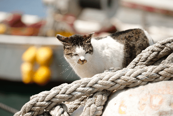 藍島に猫が多く住むようになったのは、もともとは漁師さんが所有する漁船のネズミ対策として猫を飼ったのが始まりだそうです。港に停泊している船の数は多く、いかに漁業が島の方の暮らしと結びついているかが分かります。猫たちも時折、地元に住む方から響灘で獲れた新鮮な小魚をいただけるようです。
