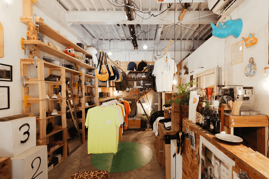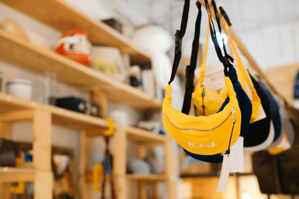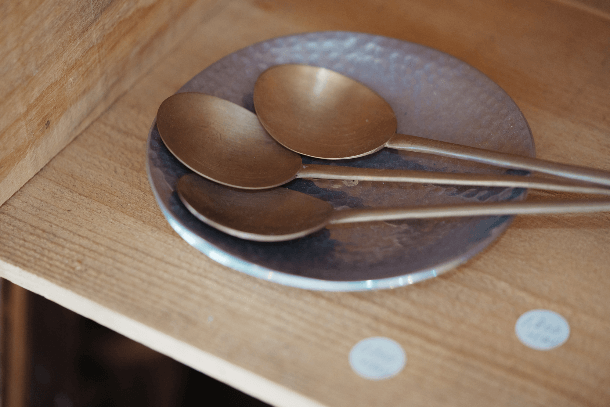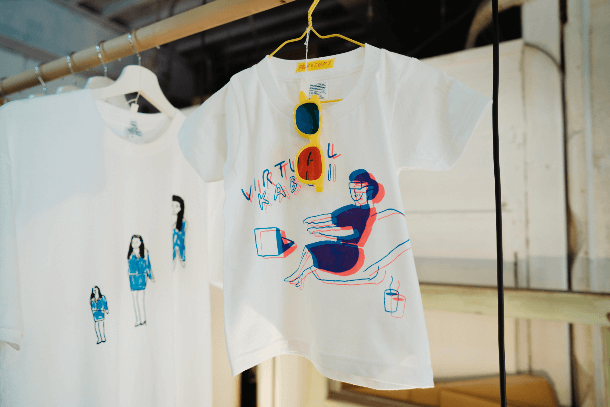 店内を見渡してみると、福岡を拠点に活動しているイラストレーター・POP COPYさんなど、クリエイターとのコラボグッズだけでなく、小豆島の真砂喜之助製麺所の手延べ素麺や、料理家・有元くるみさん監修の調味料などもラインナップ。ひとクセあるデザインのオリジナルプリントTシャツも気になります。