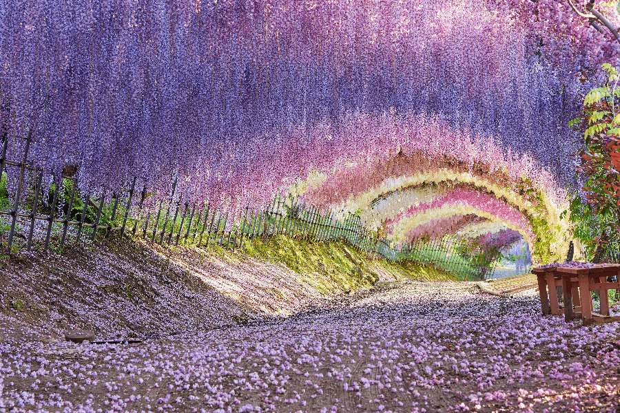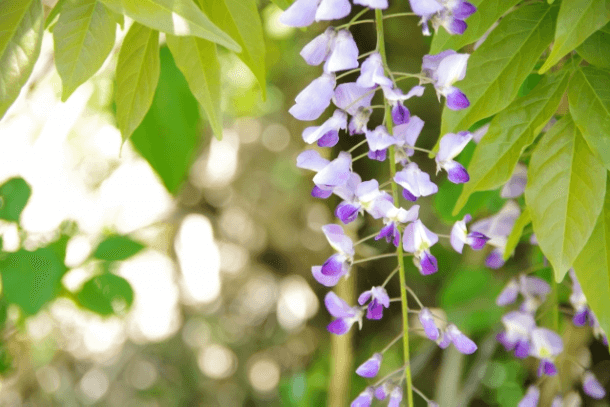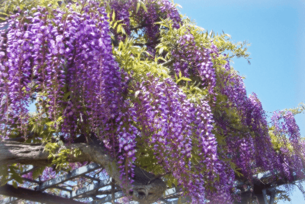 和の雰囲気を醸し、優雅で柔らかい印象を与える藤の花。最盛期には「藤のトンネル」ができ、その姿は優美で圧巻です。