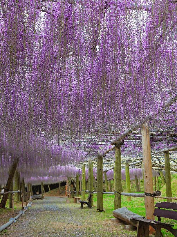 "藤のトンネル"の先にある、約1,000坪の巨大な大藤棚も必見です。色鮮やかな花が一面を覆いつくし、まるで紫色のカーテンのように風に揺れる様子はまさに幻想的。