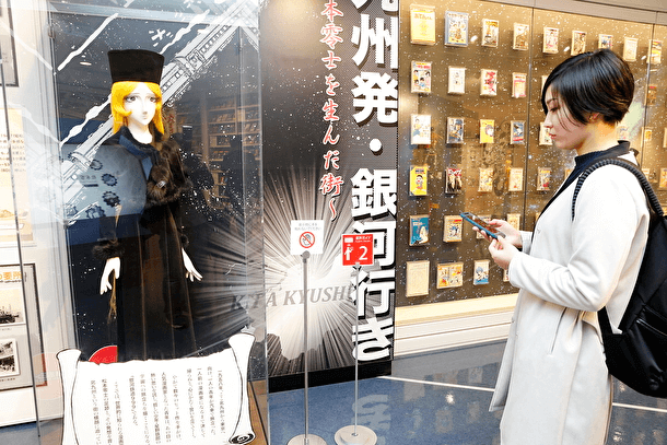 北九州市漫画ミュージアムの入場カウンターには「銀河鉄道999」のメーテルのお姉さんがいて、なんともユニーク。これは漫画ミュージアムの名誉館長である松本零士氏が生み出した作品にちなんだ演出です。