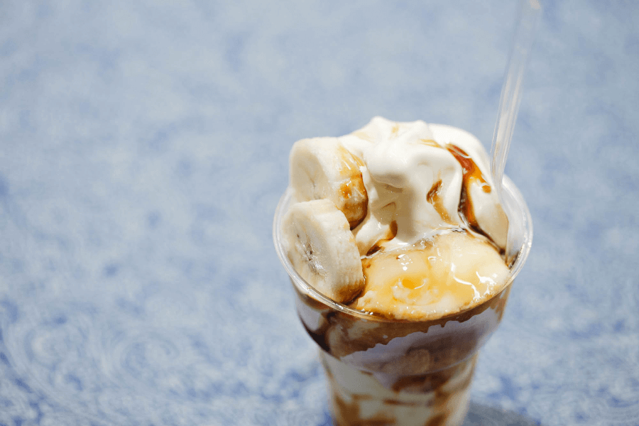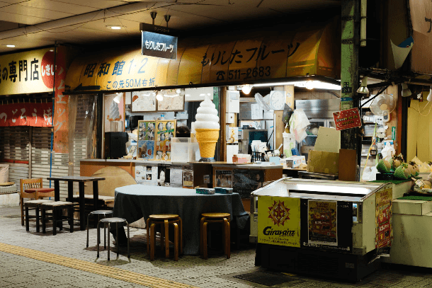 旦過市場の入口でひときわ目を引くレトロな店構えの『もりしたフルーツ』。ここはフルーツジュースやスムージー、ソフトクリーム、パフェなどを販売する人気の果物屋さんです。