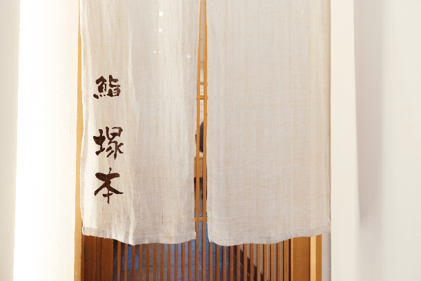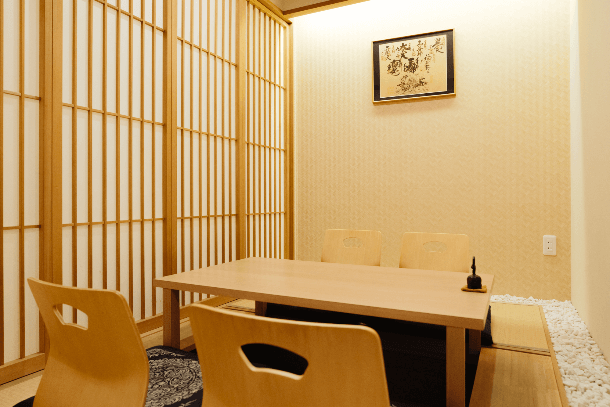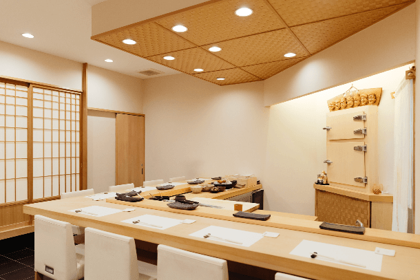 シャキッと背筋が伸びるような白いのれんをくぐると、L字型のカウンターと掘りごたつ席の個室2部屋からなる洗練された空間が広がります。