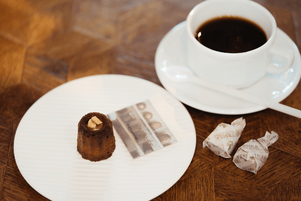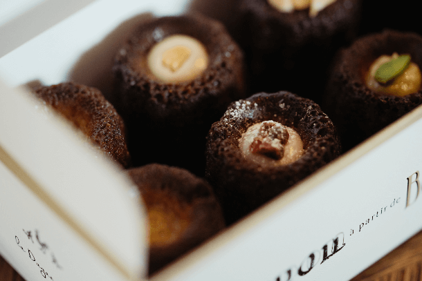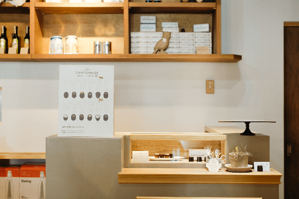 店の奥に足を進めると、突如現れるカヌレ屋のカウンター。矢野さんがフランスで強く惹かれたと話すカヌレは、すべてお店のオリジナル。テイクアウトはもちろん、店内のイートインスペースで食べることも。