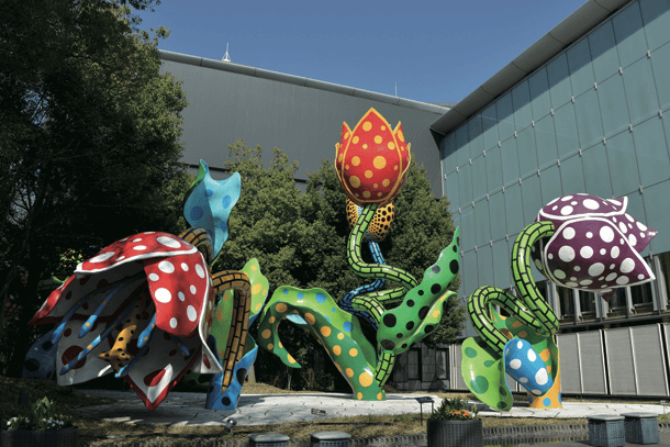 2002年に開館した松本市美術館。「黒い蔵」をイメージした外観と、前衛アーティスト草間彌生の野外彫刻《幻の華》との対比が美しく、今と昔がベストマッチした美術館です。子どもたちが芸術に親しめるワークショップも随時開催されています。